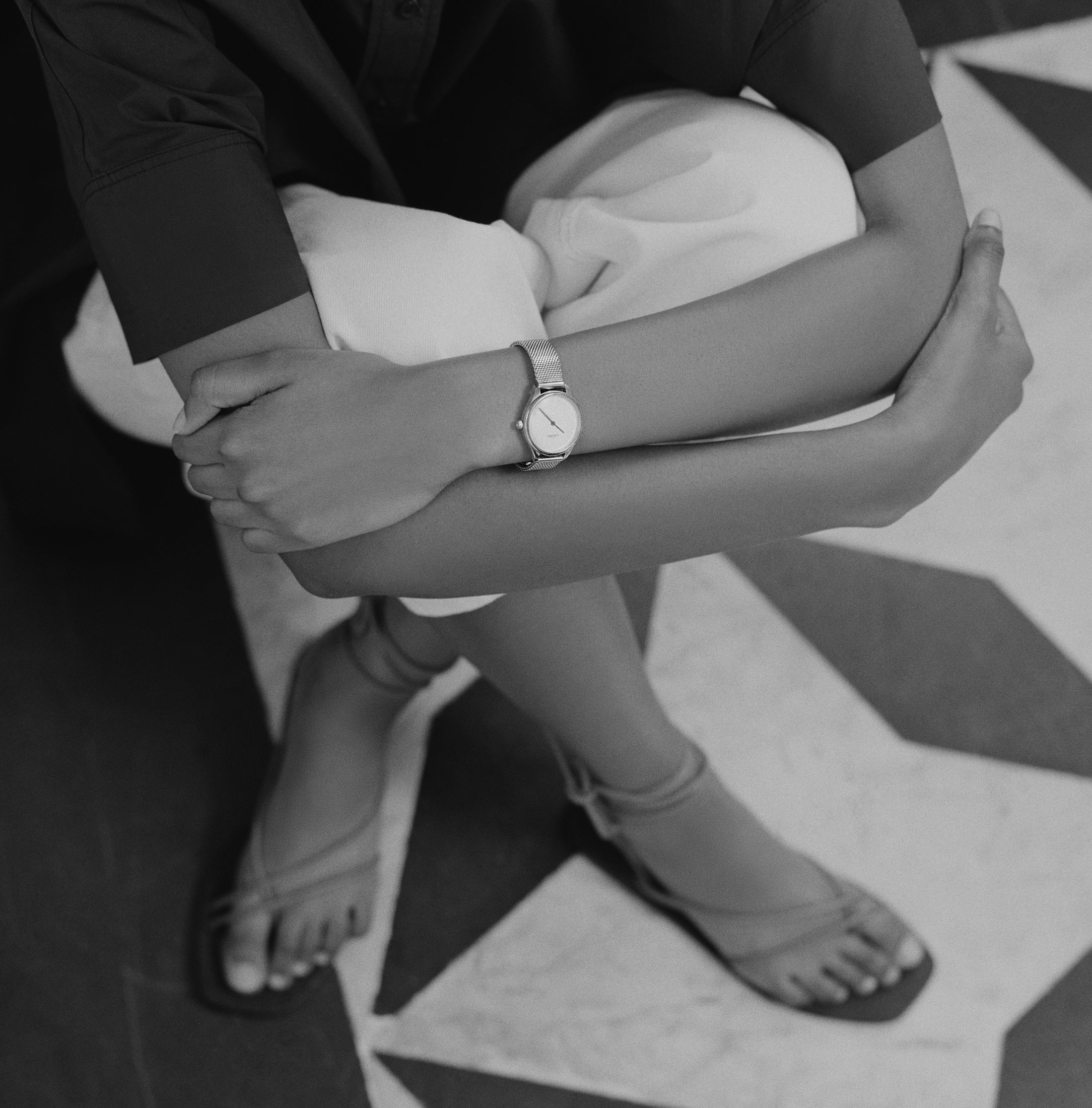 A minimal, modernist watch with a soft white, pearlized dial. Paired with a stainless steel mesh strap.